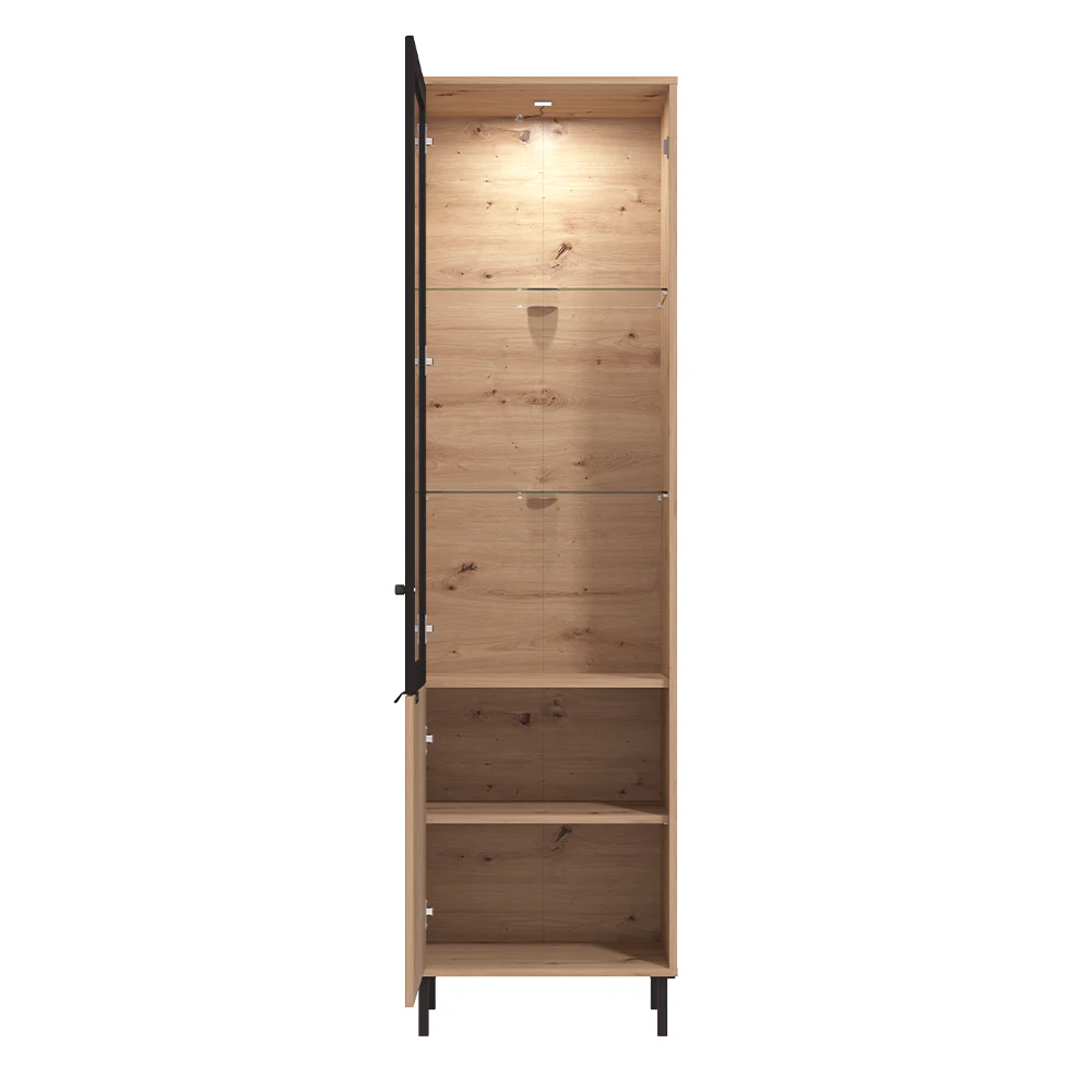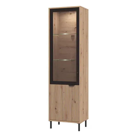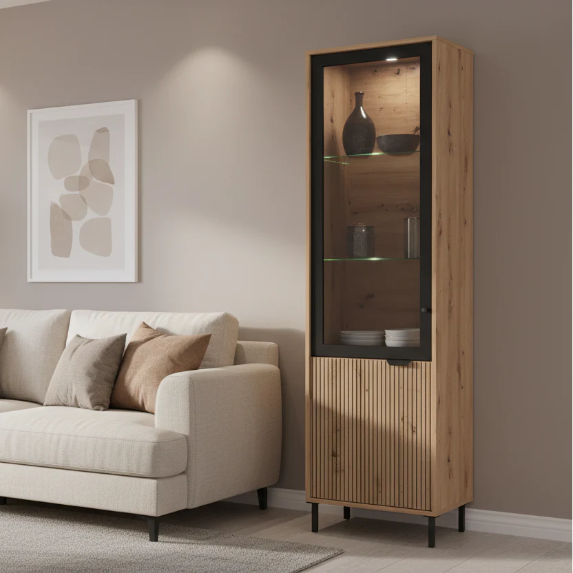 Ekspozitor modern me linja të pastra dhe dizajn elegant, që kombinon efektin natyral të drurit me detaje të errëta për një pamje bashkëkohore. Pjesa e sipërme me derë xhami është ideale për ekspozimin e objekteve dekorative, ndërsa pjesa e poshtme me derë të mbyllur ofron hapësirë praktike për ruajtjen e sendeve të përditshme. Këmbët metalike i japin stabilitet dhe një karakter modern mobiljes.