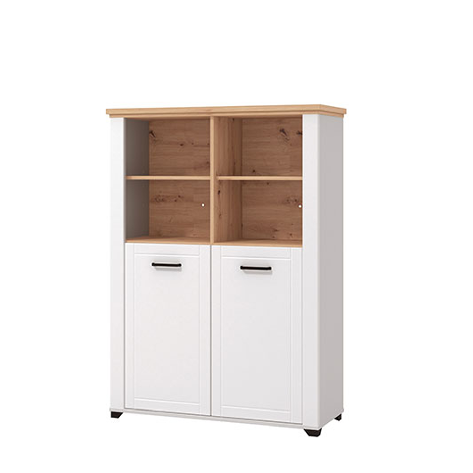 Ekspozitor me dizajn modern dhe linja të pastra, ideale për organizimin dhe ekspozimin e librave, dekorimeve apo aksesorëve të ndryshëm. Kombinimi i ngjyrës së bardhë me elementët në efekt druri krijon një pamje të ngrohtë dhe elegante që përshtatet lehtësisht me stile të ndryshme interieri. Pjesa e poshtme me dy dyer ofron hapësirë praktike për ruajtjen e sendeve të përditshme.