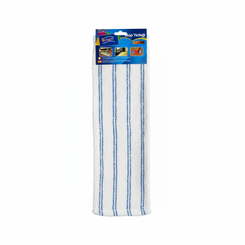 Kjo leckë zëvendësuese nga mikrofibra pastron në mënyrë efikase dyshemetë si në pastrim të thatë ashtu edhe në të lagësht, duke thithur shpejt ujin dhe papastërtitë. Pëlhura e bardhë me vija blu i jep dukje të pastër dhe e bën të lehtë identifikimin e zonave të ndotura. E përshtatshme për shumicën e mopëve të sheshtë, ajo është ideale për përdorim të përditshëm në shtëpi ose ambiente pune. Shitet në paketim prej 1 cope.