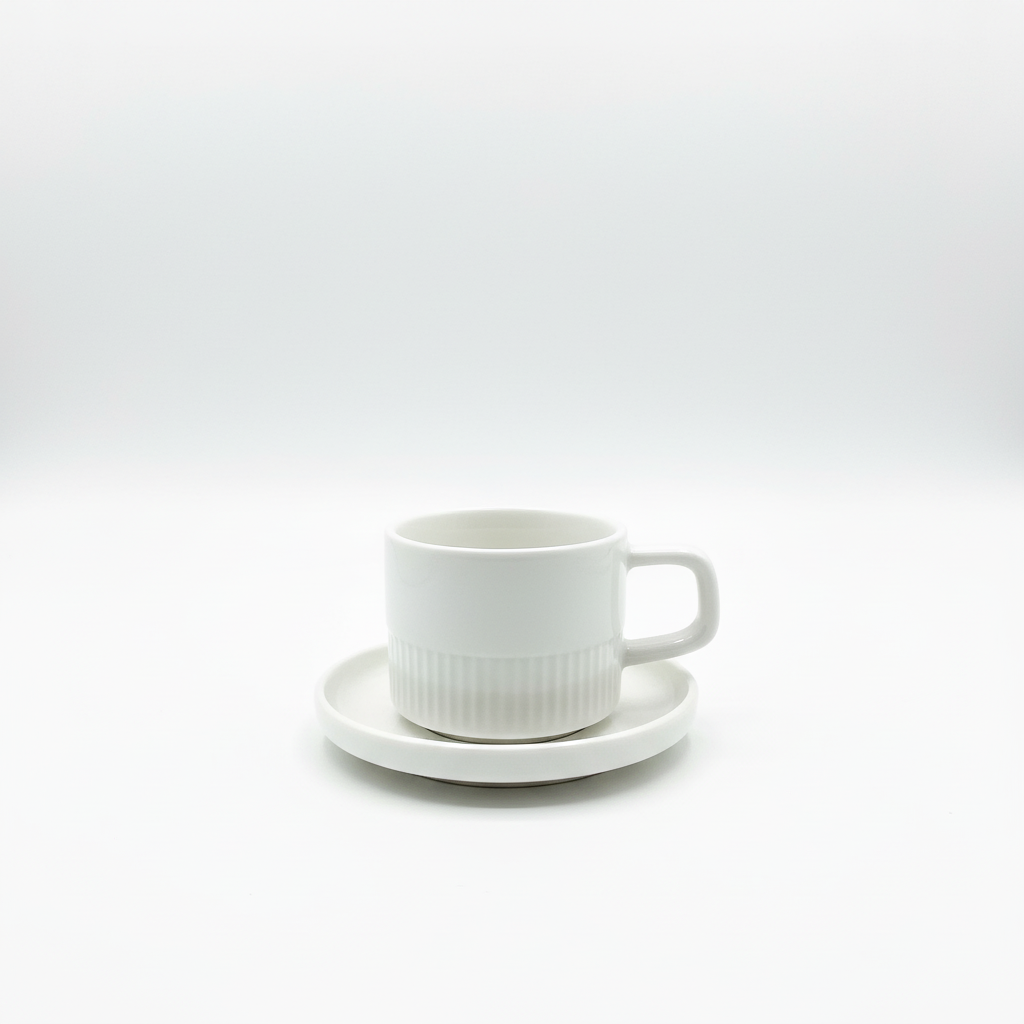 Set elegant filxhani me nënbazë prej porcelani të bardhë me kapacitet 140 ml, ideal për kafe ose çaj. Dizajni minimalist me teksturë të brinjëzuar e bën të përsosur për përdorim të përditshëm.