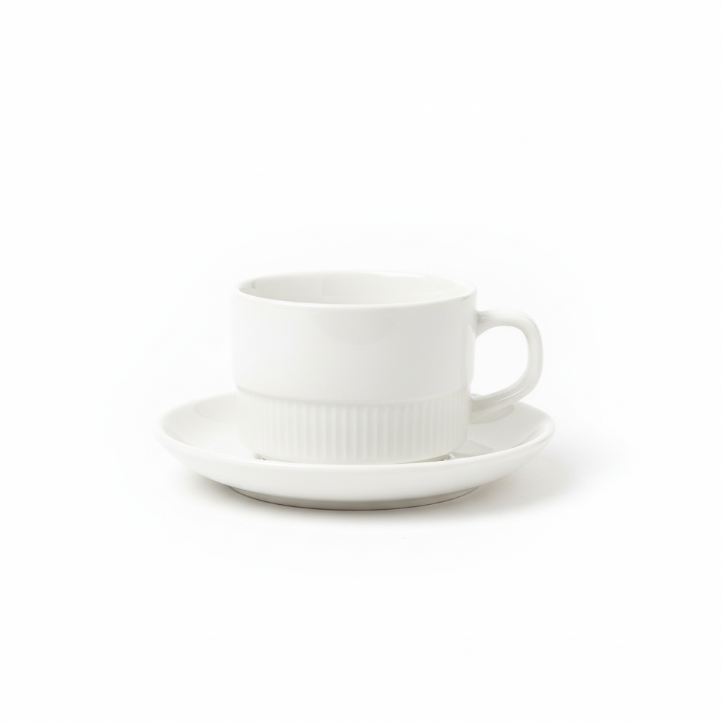 Set filxhani me taso prej porcelani të bardhë me dizajn të thjeshtë dhe reliev në pjesën e poshtme, ideal për shërbimin e përditshëm të pijeve të nxehta. Kombinimi i filxhanit me taso e bën të përshtatshëm për përdorim në shtëpi apo në ambiente profesionale.