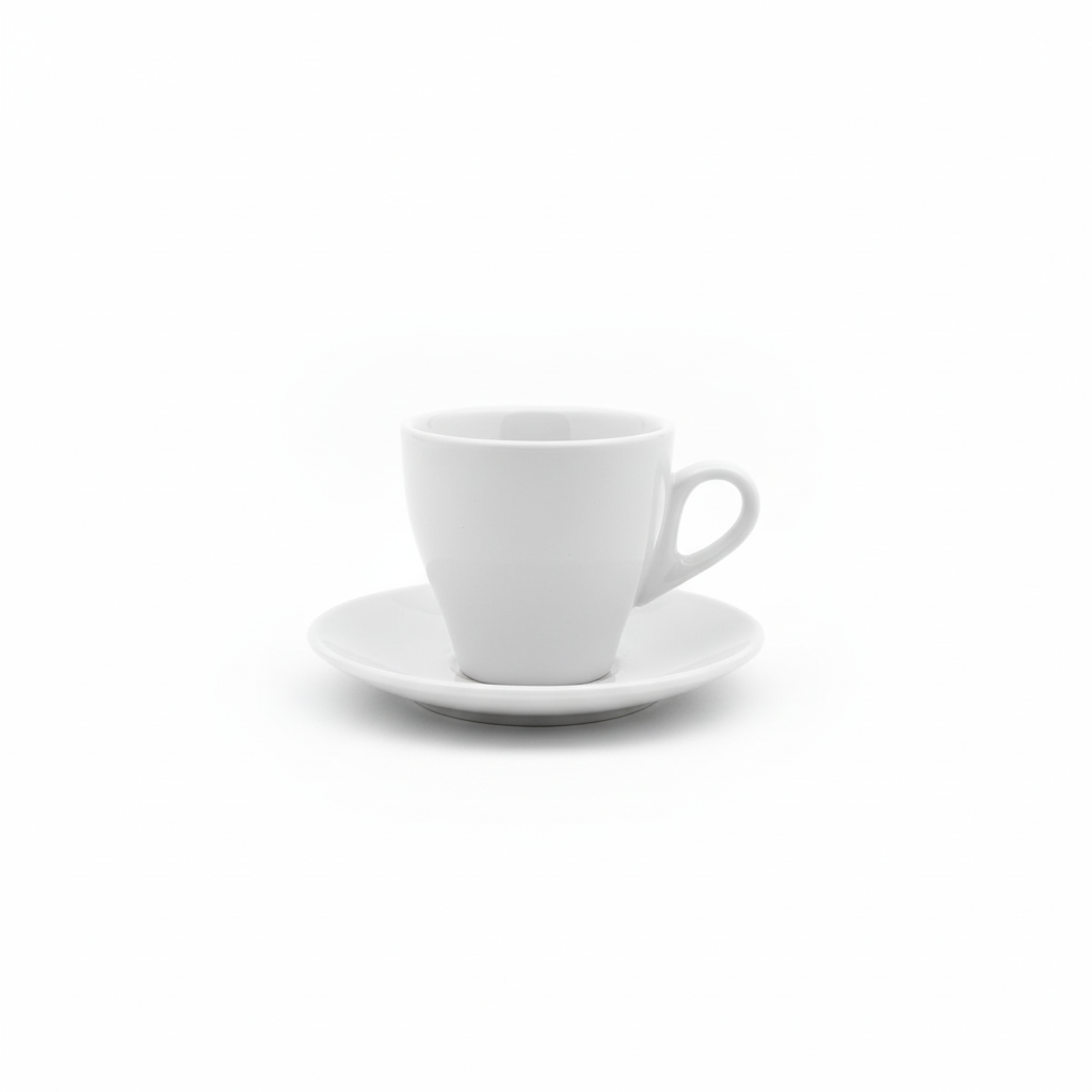 Set i thjeshtë dhe elegant filxhanësh kafeje me pjatë, nga qeramika në ngjyrë të bardhë, ideal për përdorim të përditshëm ose për servirje mysafirësh.