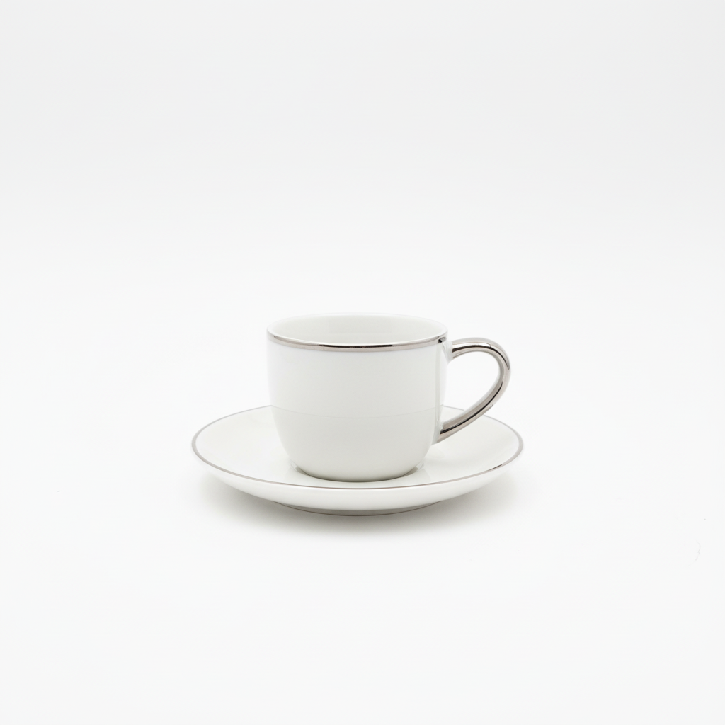 Set elegant filxhani dhe pjatëzeje për servirjen e kafesë, në ngjyrë të bardhë me detaje argjendi për një pamje moderne dhe të rafinuar në tavolinë.