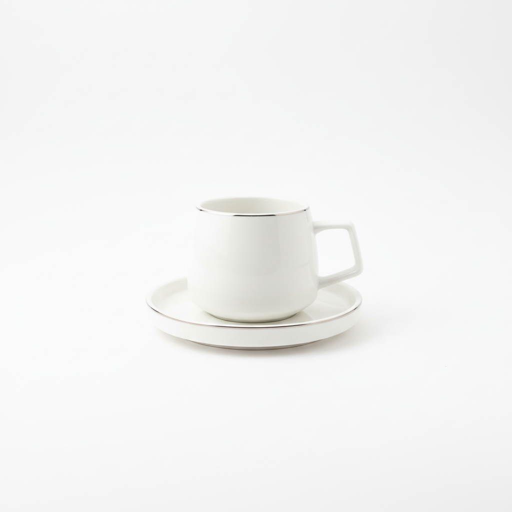 Set elegant filxhani dhe pjate kafeje prej qeramike të bardhë me dizajn minimalist dhe detaj metalik diskret në buzë. Ideale për shërbimin stilor të kafesë ose espressos në përditshmëri apo për mysafirë.