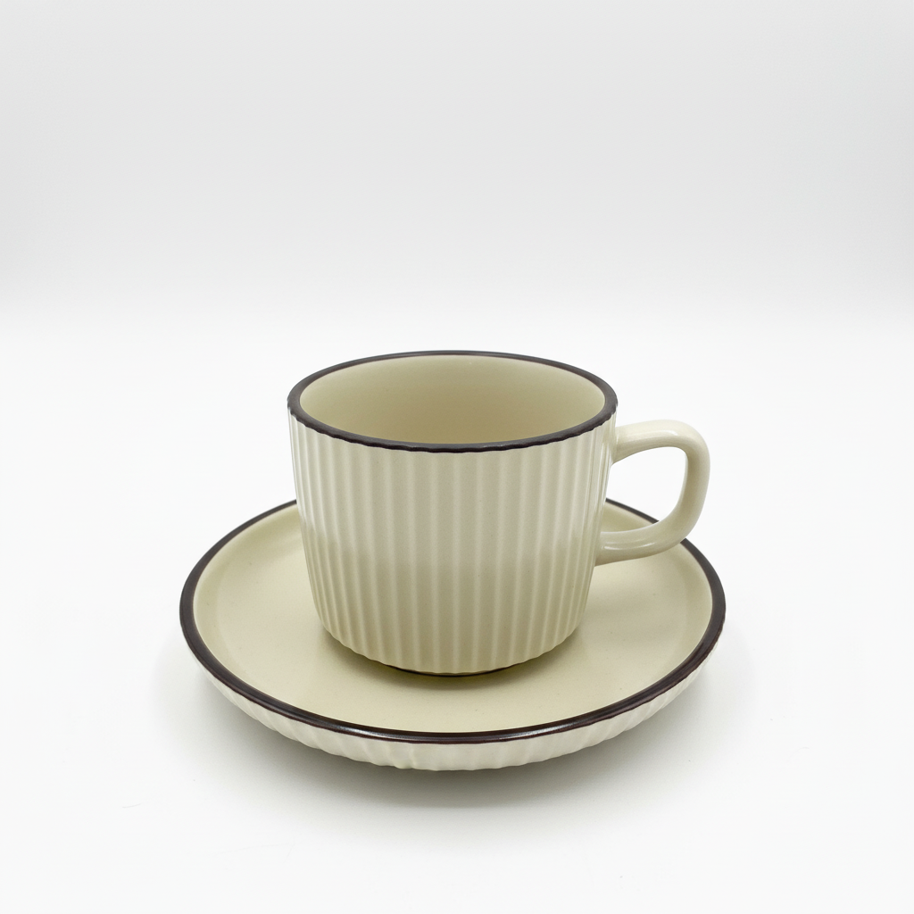 Set elegant filxhani dhe pjate bezhë me dizajn të theksuar me vija dhe buzë të errët kontrastuese. Ideale për shijimin e përditshëm të kafesë ose çajit me stil modern.