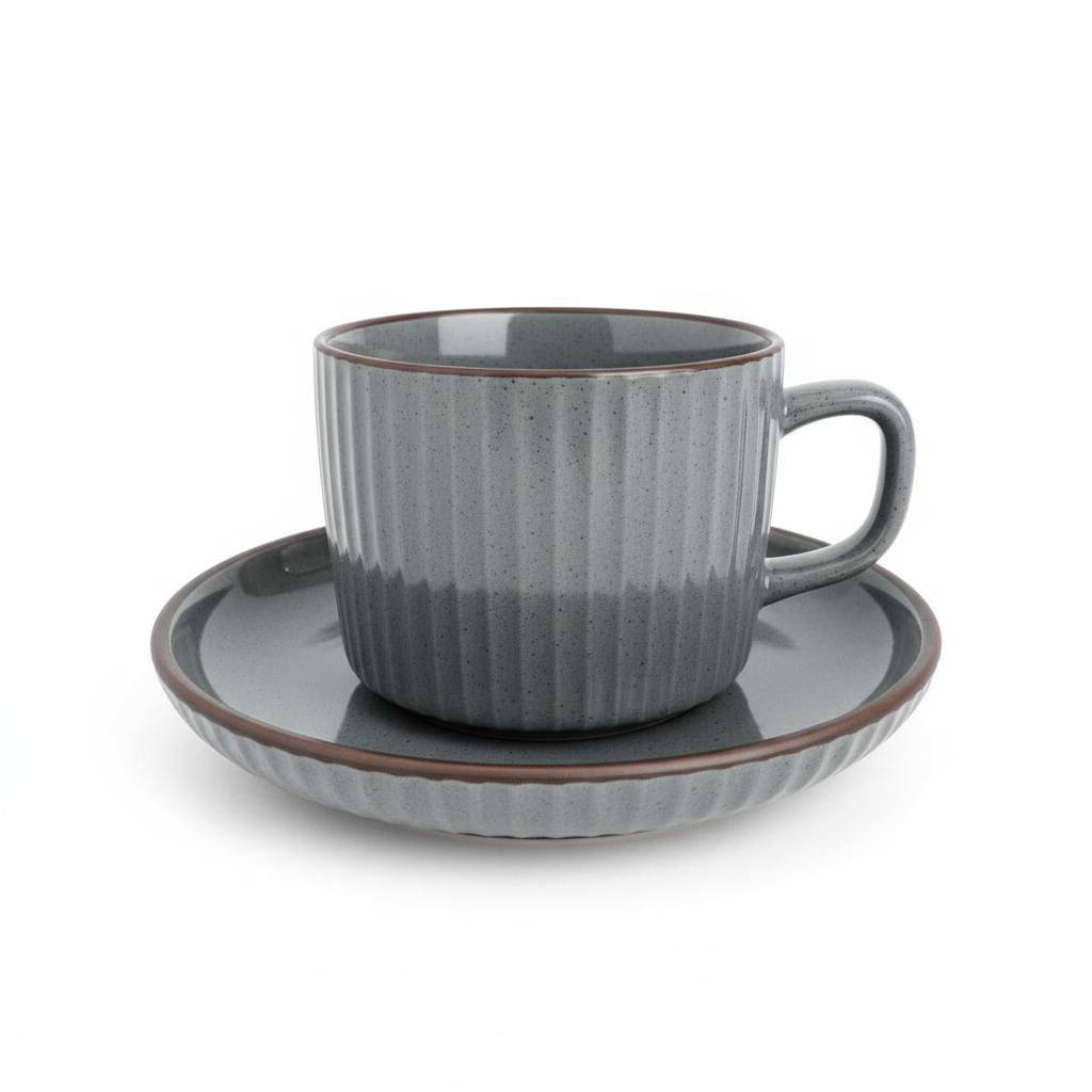 Set elegant filxhani kafeje në ngjyrë gri me pjatëz të përputhur, i realizuar në qeramikë me dizajn modern dhe minimalist. Tekstura me vija vertikale i jep stil të veçantë dhe të rafinuar çdo servirjeje.