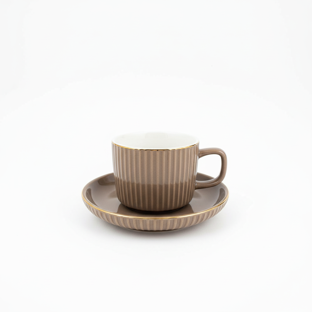 Set elegant filxhani dhe pjatëze kafeje me dizajn modern minimalist në ngjyrë kafe, i kombinuar me brendësi të bardhë dhe detaj buzë në ngjyrë ari. Tekstura me vija dhe doreza e madhe ofrojnë stil dhe rehati në përdorim të përditshëm.