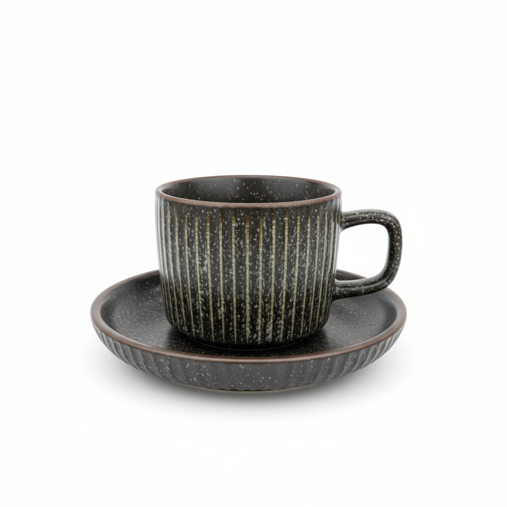 Set elegant filxhani kafeje me pjatë në ngjyrë të zezë me pika, me dizajn modern rustik dhe teksturë vertikale. Ideale për servirje stilike të kafesë në përditshmëri apo raste të veçanta.