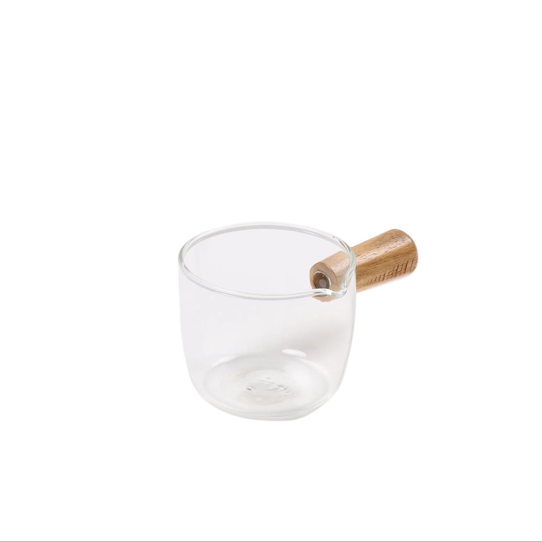 Filxhan modern dhe minimalist për kafe ekspres, me dizajn elegant që kombinon qelqin transparent me dorezë druri natyral.