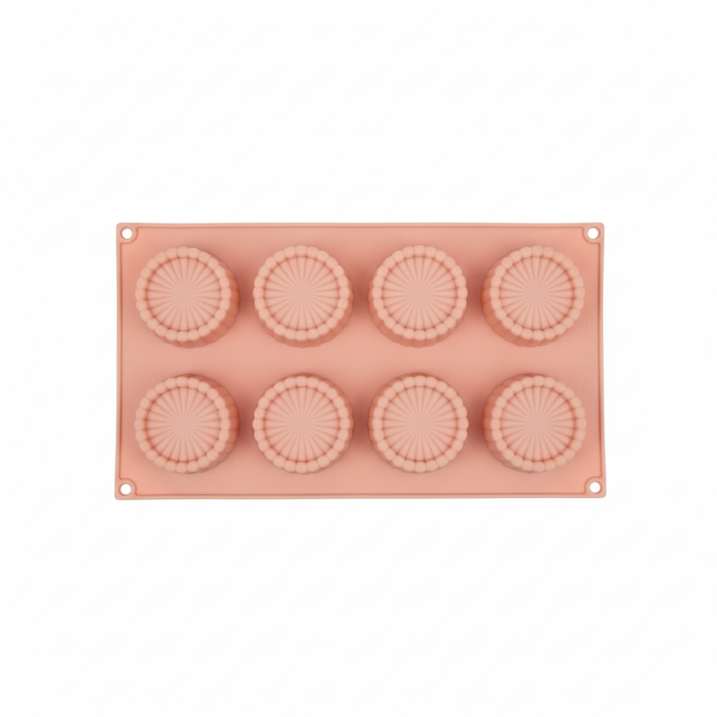 Tabaka silikoni me 8 forma cupcake me dizajn të rrumbullakët të valëzuar dhe buzë me rruaza, ideale për pjekje të lehtë dhe servirje elegante. Materiali fleksibël dhe jo-ngjitës siguron nxjerrje të thjeshtë të ëmbëlsirave dhe pastrim të shpejtë.