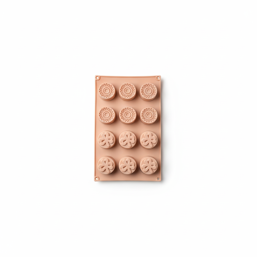 Tabaka silikoni me 12 vende për cupcake ose muffin me forma rrethore dhe dizajne lulesh dekorative. Materiali fleksibël e jo-ngjitës e bën përgatitjen dhe heqjen e ëmbëlsirave të thjeshtë dhe të pastër.