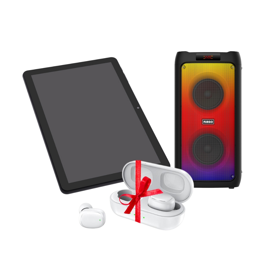 Ky set FUEGO përfshin një tablet multifunksional me aksesorë, një party speaker me fuqi të lartë dhe kufje wireless si dhuratë. Seti është i përshtatshëm për përdorim të përditshëm, argëtim, dëgjim muzike dhe aktivitete multimediale, duke kombinuar pajisje praktike në një paketë të vetme.