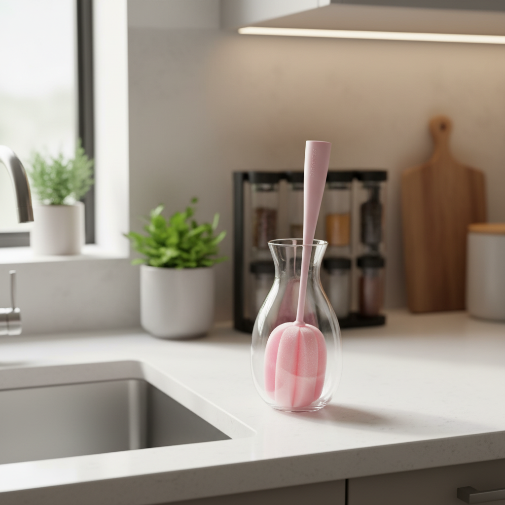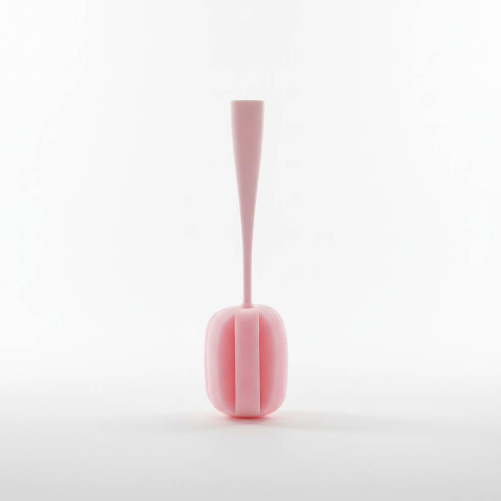 Furça sfunguese me dorëz plastike të gjatë në ngjyrë rozë është ideale për pastrimin e shisheve, gotave dhe enëve të larta. Koka prej sfungjeri të butë pastron me lehtësi pa gërvishtur sipërfaqet.
