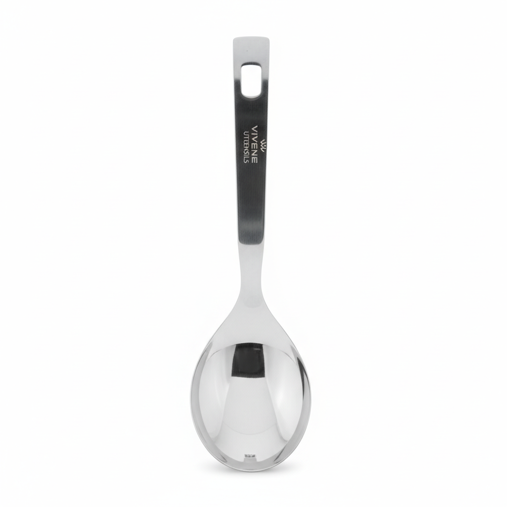 Lugë e madhe kuzhine prej çeliku inoks për përzierje dhe shërbim të ushqimeve. Dizajni i plotë metalik e bën të përshtatshme për përdorim të përditshëm në çdo kuzhinë.