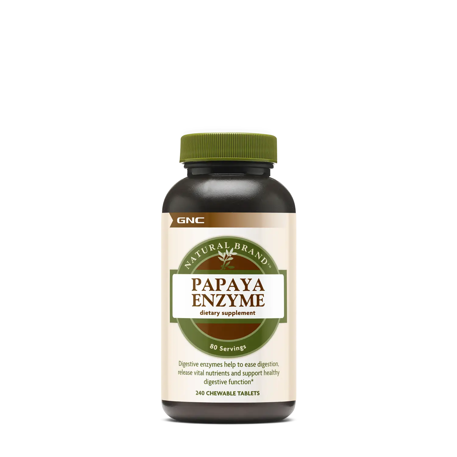 GNC Natural Brand™ Papaya Enzyme përmban enzimën proteolitike papain, e përftuar nga fruti i papajas (Carica papaya). Enzimat tretëse ndihmojnë në lehtësimin e tretjes, çlirojnë lëndë ushqyese nga ushqimi dhe mbështesin funksionin e shëndetshëm të sistemit tretës.
