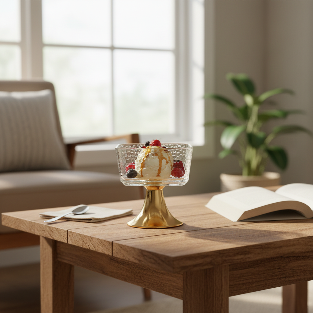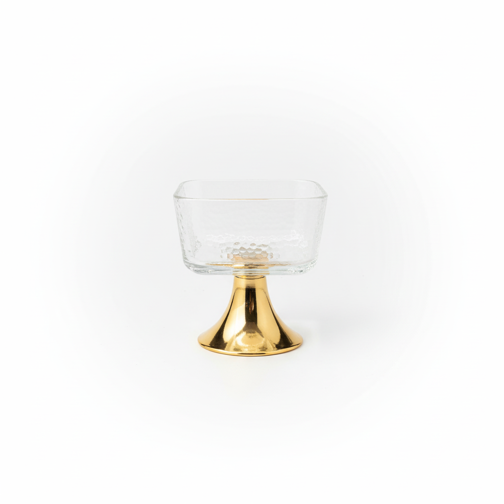 Pjatë elegante shërbimi me tas katror qelqi me reliev dhe bazë dekorative metalike në ngjyrë ari, ideale për servirjen e ëmbëlsirave dhe snack-eve të vogla. Plotëson bukur çdo tryezë dhe shton një prekje moderne dekorative.