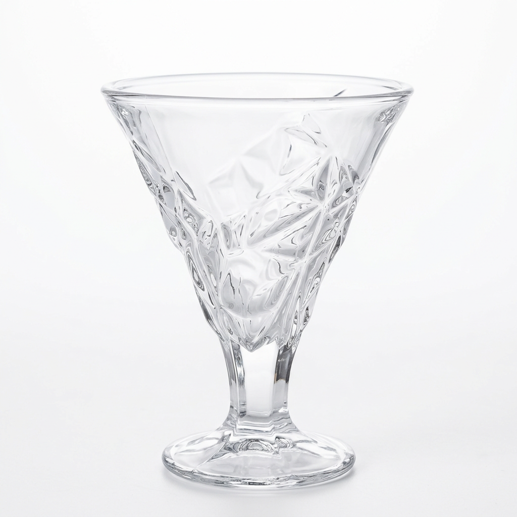 Seti përbëhet nga 6 kupa akulloreje prej qelqi transparent, ideale për servirjen elegante të akullores dhe ëmbëlsirave të ndryshme. Dizajni dekorativ me reliev i kupës krijon lojë dritash që e bën çdo servirje të duket më festive, ndërsa baza me këmbë piedestal siguron stabilitet në tavolinë. Me një kapacitet rreth 180 ml, këto kupa janë të përsosura për porcione individuale.