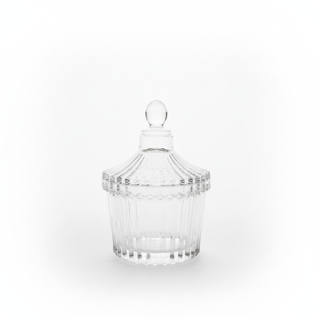 Kavanoz elegant qelqi me kapak dekorativ, i përsosur si enë ruajtjeje dhe aksesor i rafinuar për çdo ambient shtëpie.