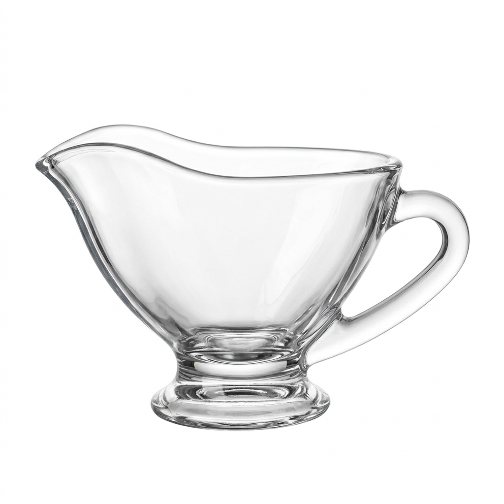 Kjo gotë qumështi prej qelqi transparent është ideale për servirjen e qumështit, salcave ose pijeve të ndryshme në tryezën tuaj. Gryka speciale e derdhjes siguron hedhje të saktë dhe pa pike, ndërsa doreza e fortë e bën mbajtjen dhe përdorimin shumë më të lehtë. Dizajni me bazë pedestali i jep qëndrueshmëri dhe stil, duke u kombinuar me çdo shije të kuzhinës. Materiali i qartë e bën të lehtë shikimin e përmbajtjes dhe kombinimin me pjesë të tjera të enëve të kuzhinës.
