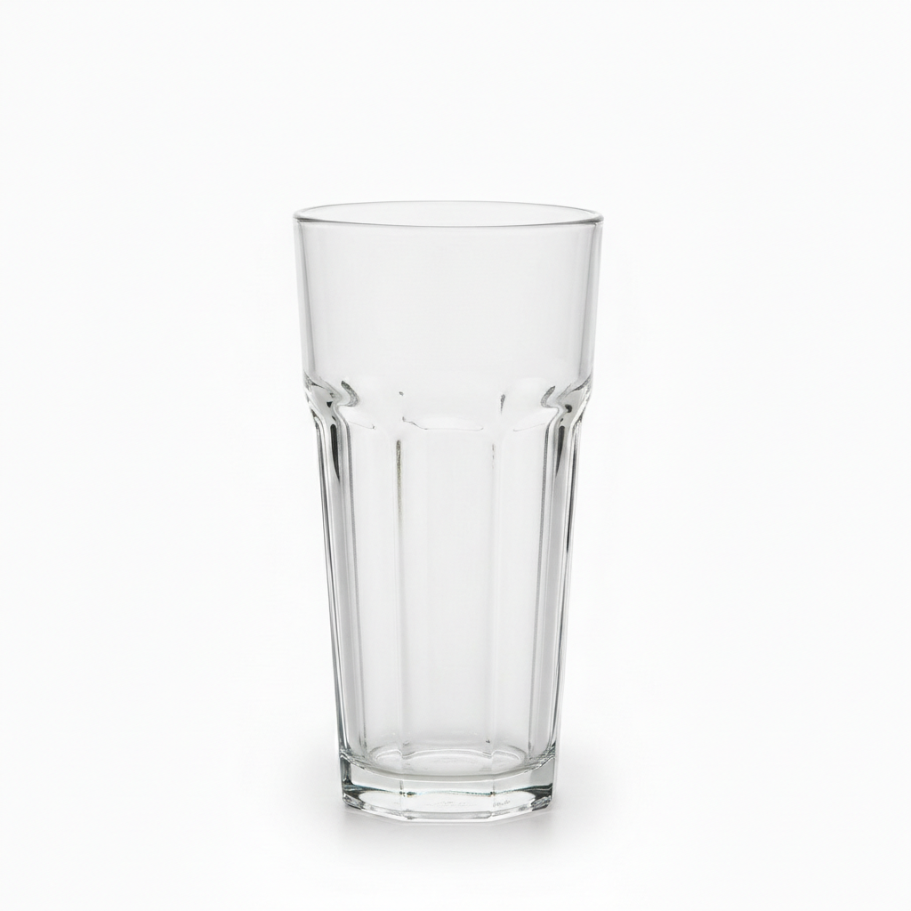 Gotë e pastër xhami me formë të lartë cilindrike, ideale për servirjen e ujit, lëngjeve dhe pijeve të ndryshme në shtëpi apo në punë. Dizajni me anë të fachetuara/panele ofron kapje të sigurt dhe pamje elegante në tryezë.