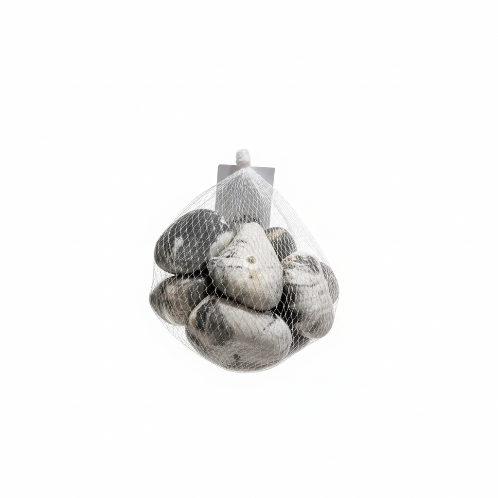 Gurra dekorative të lëmuara në tonet natyrale gri, të bardha dhe kafe, të paketuara në një qese rrjete të bardhë praktike. Ideale për të plotësuar vazo, saksi lulesh dhe kompozime të ndryshme dekorative në shtëpi.