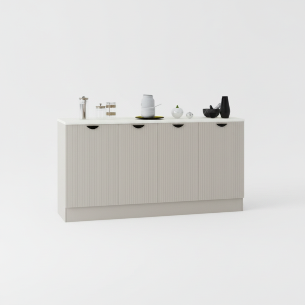 I veshur me MDF cilësor në nuancën ekskluzive Bozë (Taupe/Greige), ishulli ofron një pamje skulpturore dhe të pastër. Sipërfaqja e tij mat dhe e lëmuar krijon një ndjesi qetësie, ndërsa struktura solide ofron gjithë mbështetjen që ju duhet për aventurat tuaja kulinare.