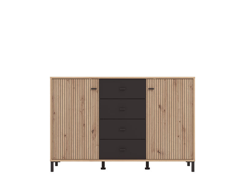 Kabineti Avi kombinon dizajnin modern me elemente natyrale, duke krijuar një mobilie elegante dhe funksionale për ambientin tuaj. Pjesa frontale me linja vertikale në ngjyrë druri krijon një teksturë të ngrohtë dhe moderne, ndërsa pjesa e sipërme në ngjyrë të zezë i jep kontrast dhe karakter minimalist. Ideale për korridor, dhomë ndenjeje apo dhomë gjumi.