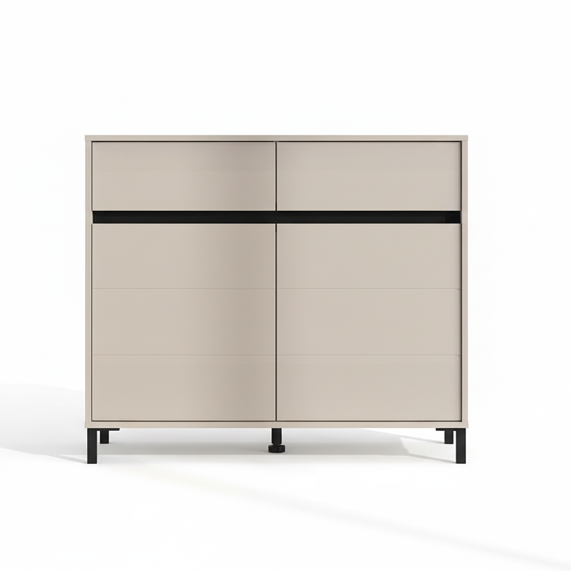 Kjo komodinë me linja të pastra dhe dizajn bashkëkohor është zgjidhja ideale për organizimin e rrobave dhe aksesorëve në dhomën e gjumit apo në çdo ambient tjetër të shtëpisë. Ngjyra neutrale e kombinuar me detajin horizontal në të zezë krijon një pamje elegante dhe moderne.