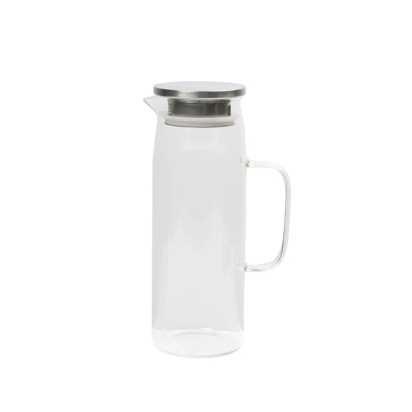 Kanë elegante prej qelqi transparent, ideale për servirjen e ujit, lëngjeve, çajit të ftohtë apo pijeve freskuese. E pajisur me kapak inox dhe filtër të integruar, që parandalon derdhjen e akullit apo frutave gjatë përdorimit.