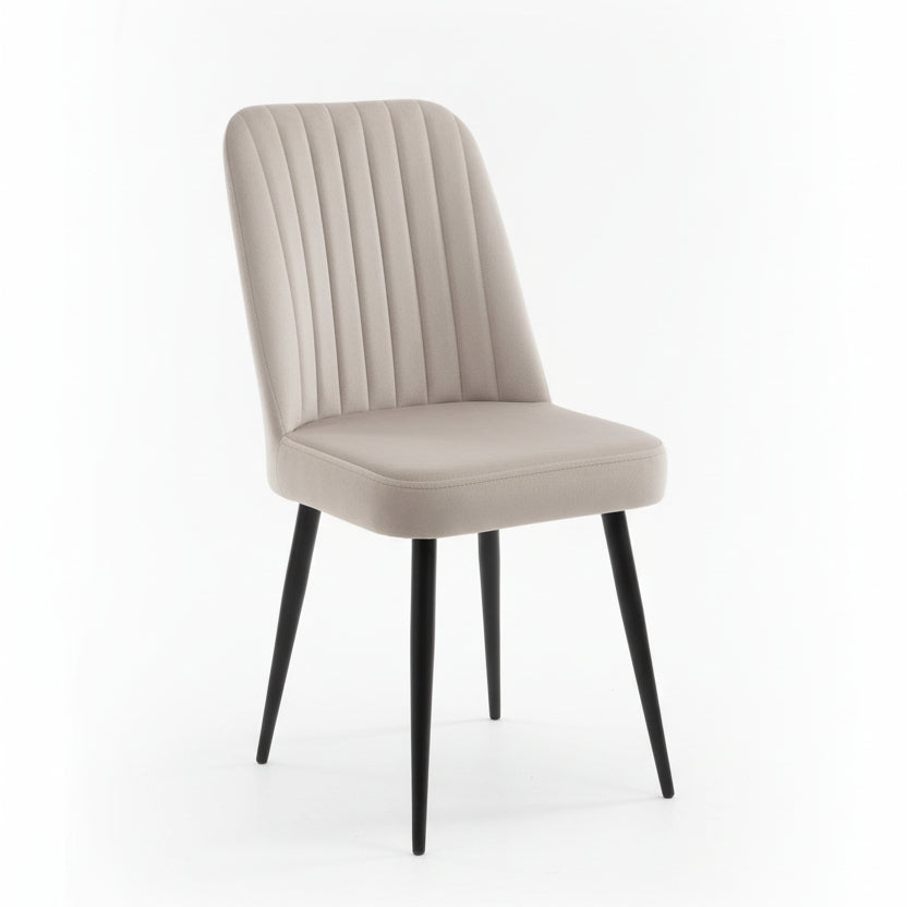 Karrige moderne me dizajn të rafinuar dhe tapiceri në ngjyrë bezhë, e cila sjell ngrohtësi dhe elegancë në çdo ambient. Mbështetësja e lartë me qepje dekorative ofron komoditet gjatë përdorimit, ndërsa këmbët në ngjyrë të bardhë krijojnë një kontrast të lehtë dhe stil minimalist.