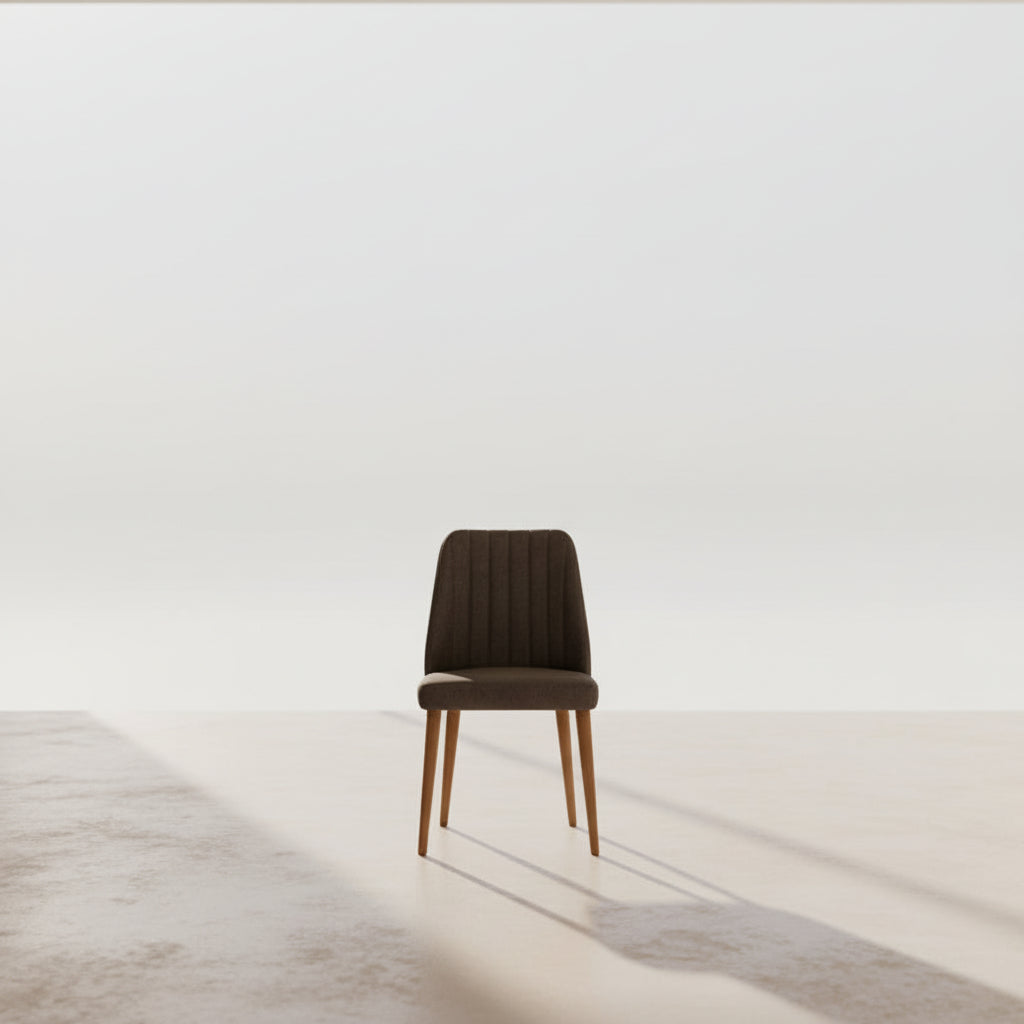 Karrige elegante me dizajn bashkëkohor, e veshur me tapiceri në ngjyrë gri të errët që i jep ambientit një pamje të sofistikuar. Mbështetësja me qepje vertikale ofron komoditet dhe stil, ndërsa këmbët prej druri në nuancë natyrale krijojnë një kontrast të ngrohtë dhe modern.