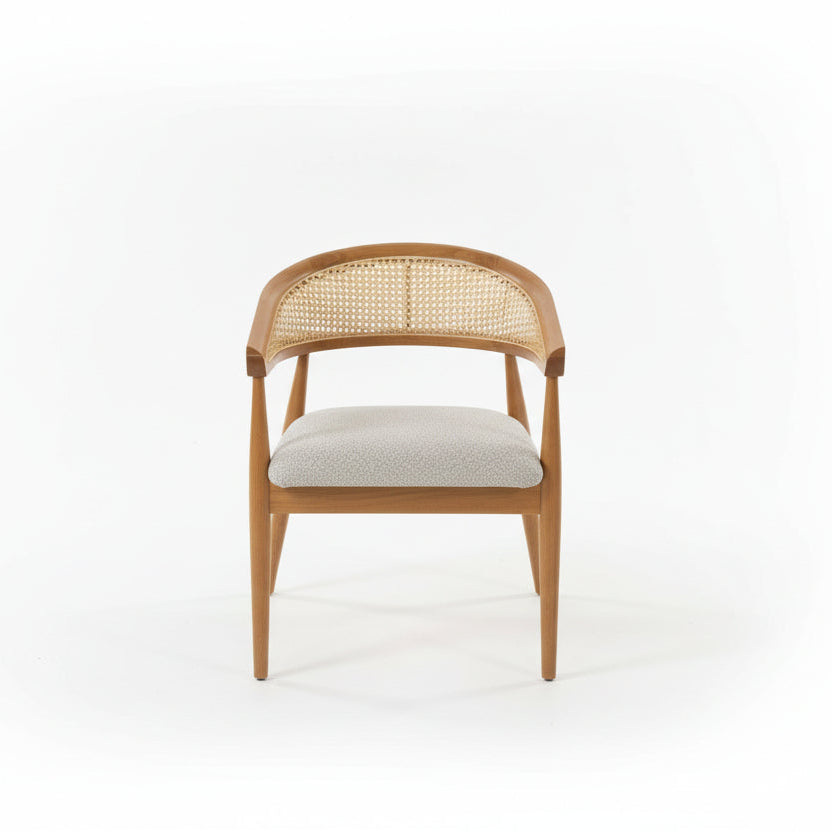 Dizajni i saj me shpinë të ajrosur prej kashte natyrale dhe struktura e lëmuar prej druri krijon një ekuilibër perfekt mes stilit rustik dhe atij modern. E plotësuar me një ulëse të butë të tapicuar në ngjyrë gri, karrigia Atlas ofron komoditet maksimal për darka të gjata dhe biseda të këndshme.
