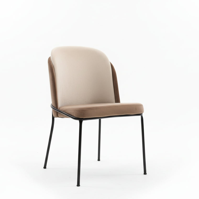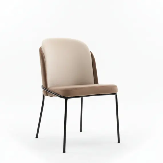 Karrige me dizajn modern dhe linja të buta, e veshur me material të butë në dy nuanca bezhë që i japin një pamje elegante dhe të rafinuar. Forma ergonomike e mbështetëses dhe sediljes ofron rehati gjatë përdorimit, ndërsa struktura metalike me këmbë të zeza siguron qëndrueshmëri dhe stil bashkëkohor.