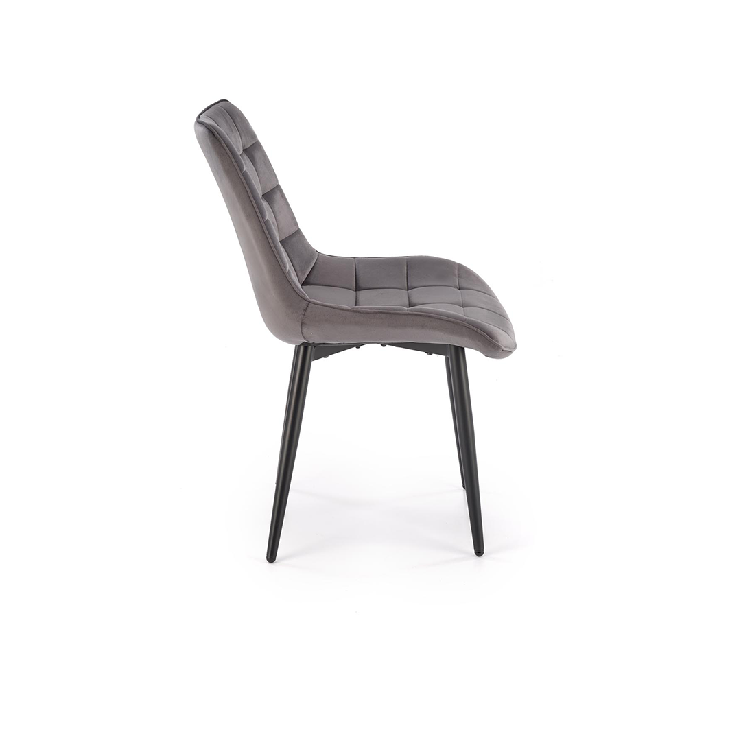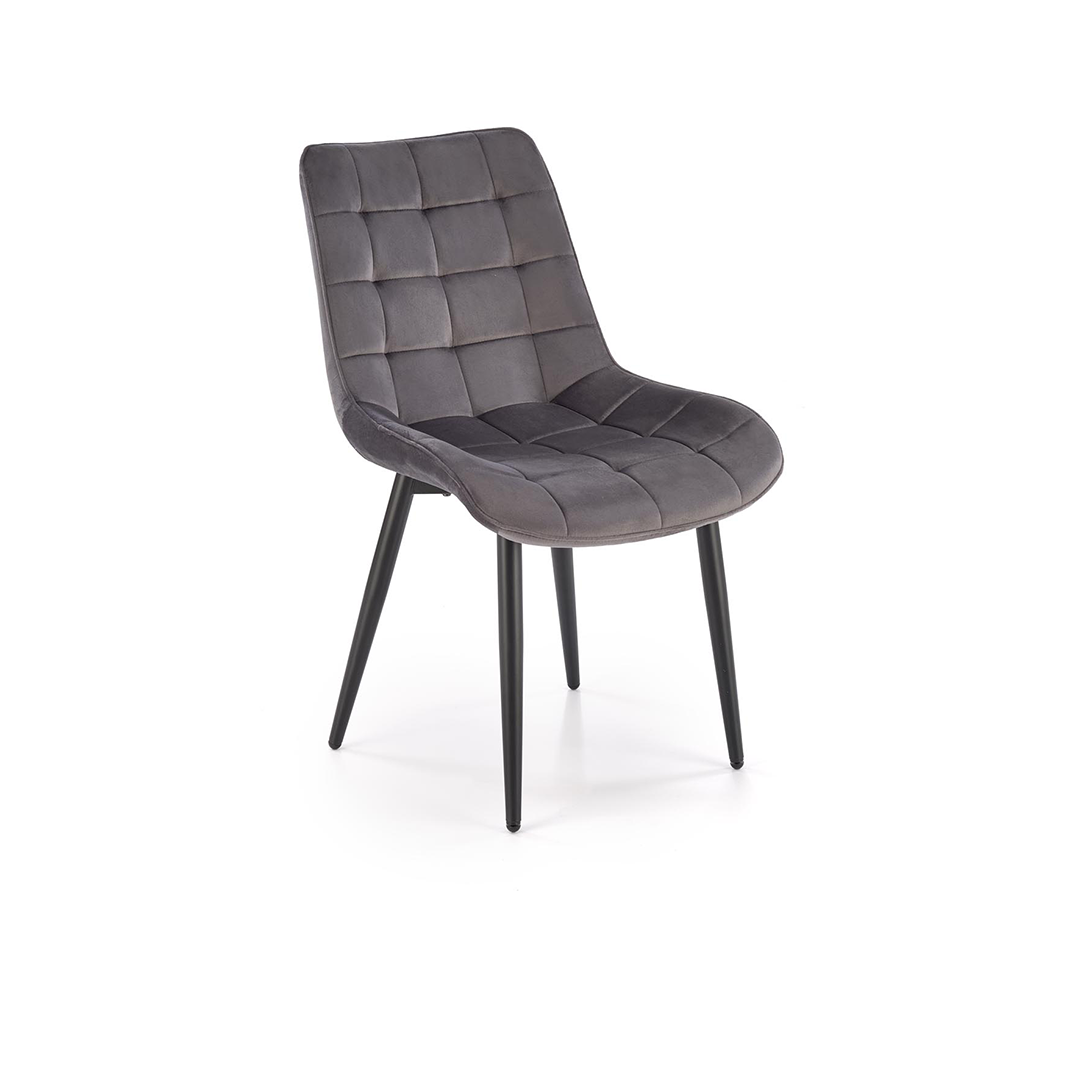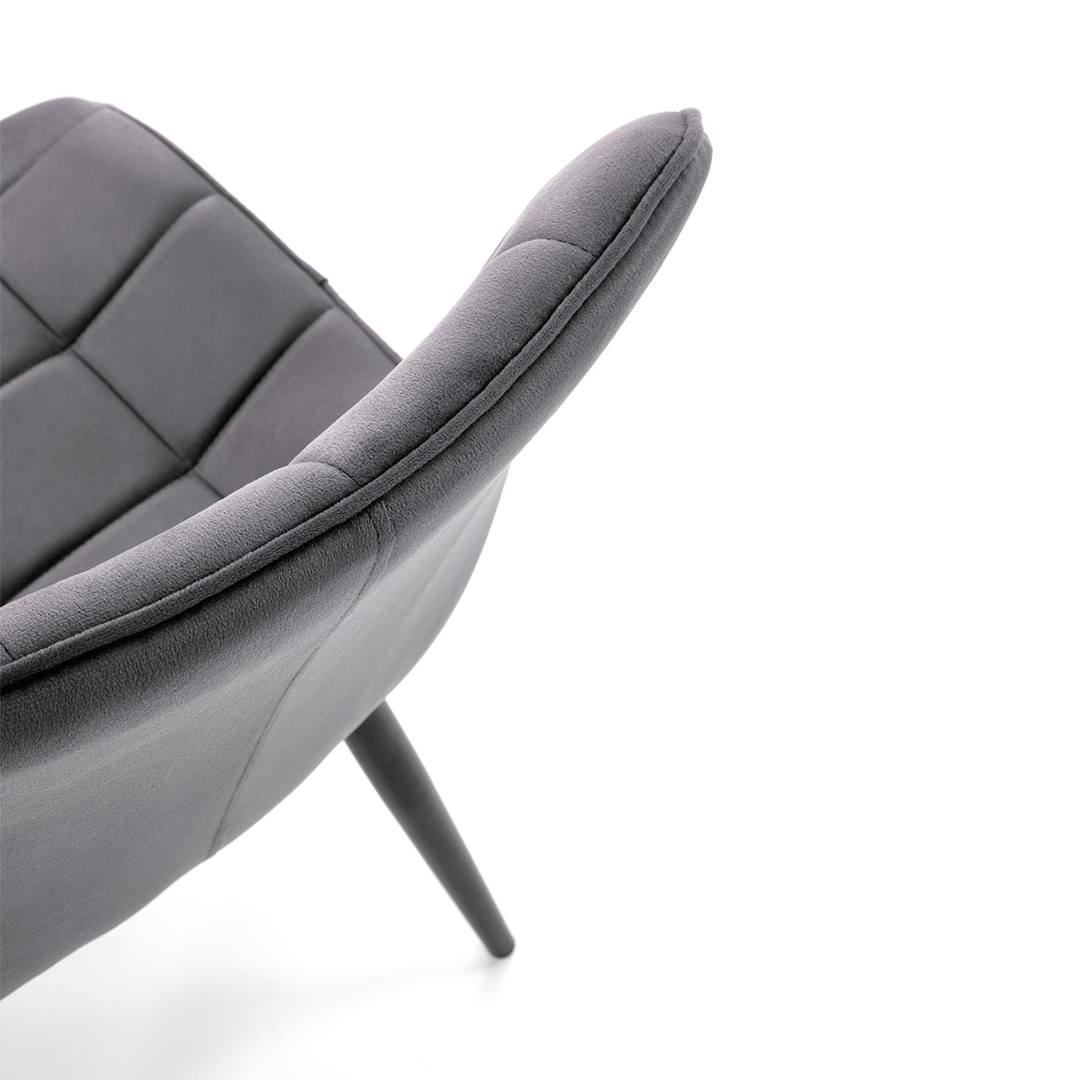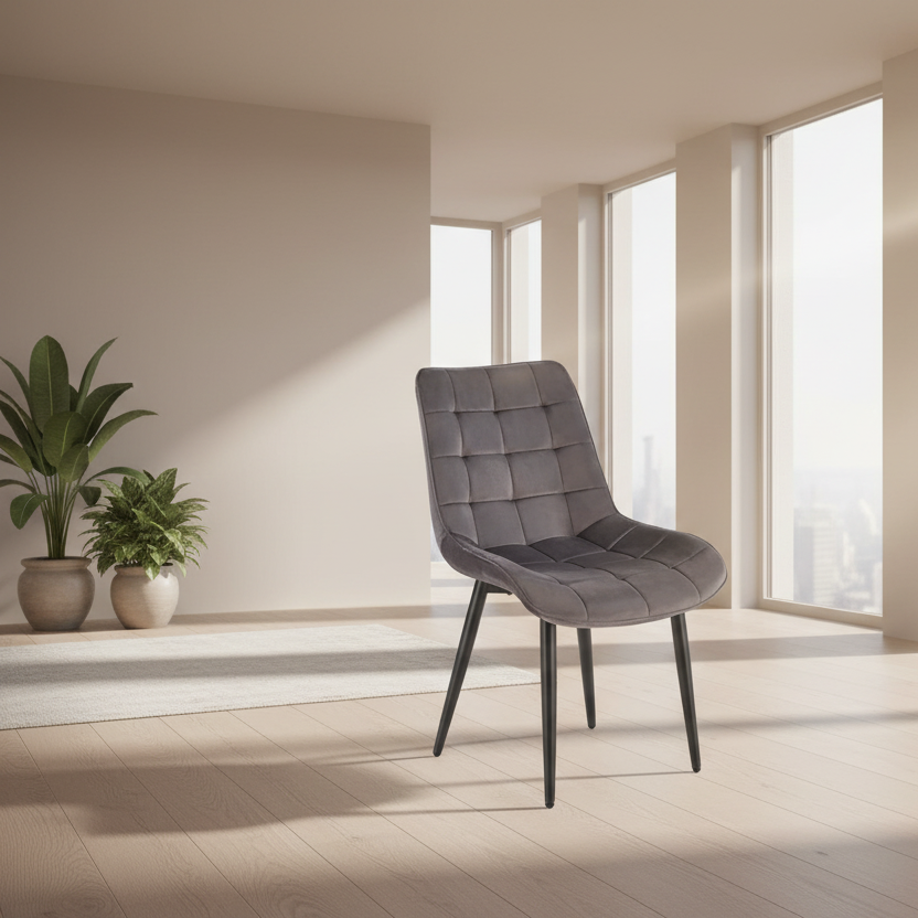 Shtoni një notë luksi dhe rehatie në tryezën tuaj me karrigen Dove. E veshur me një copë të butë prej kadifeje (velvet) në ngjyrë gri të errët, kjo karrige dallohet për qepjen e saj dekorative me kuadrate, e cila i shton teksturë dhe karakter vizual.