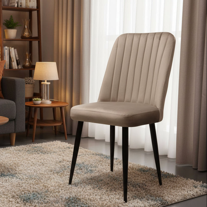 Tipari kryesor i dizajnit është mbështetësja me qepje vertikale (channel tufting), e cila i jep karriges një pamje të gjatë dhe të rafinuar, duke shtuar një element teksture pa e rënduar vizualisht. Është balanca ideale mes stilit minimalist dhe komoditetit maksimal.