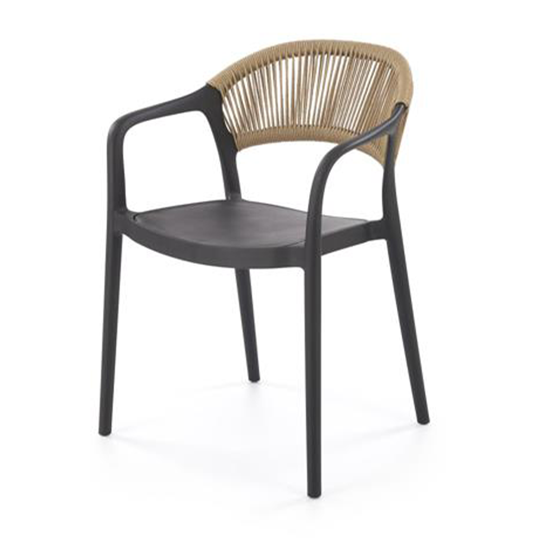 Kjo karrige moderne kombinon strukturën e fortë në ngjyrë të zezë me mbështetësen dekorative në stil thurjeje natyrale, duke krijuar një pamje elegante dhe bashkëkohore. Dizajni ergonomik me mbështetëse krahu ofron rehati gjatë përdorimit, ndërsa linjat e pastra e bëjnë të lehtë kombinimin me stile të ndryshme interieri.