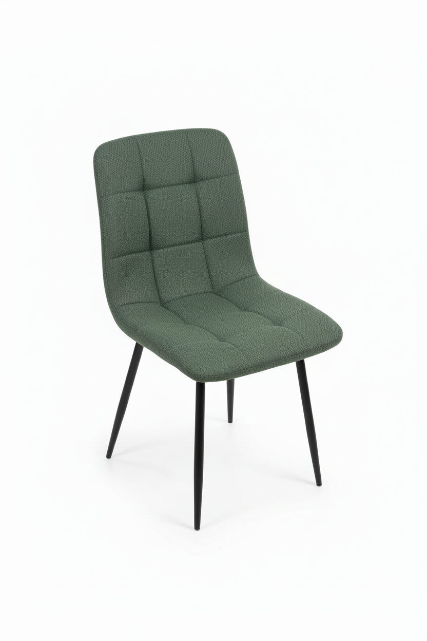 E veshur me tekstil cilësor në nuancë jeshile olivë, kjo karrige shton ngrohtësi dhe stil në çdo hapësirë ngrënieje apo ambient modern. Qepjet dekorative me forma gjeometrike krijojnë një pamje estetike të sofistikuar, ndërsa struktura e qëndrueshme me këmbë metalike të zeza garanton stabilitet dhe jetëgjatësi.