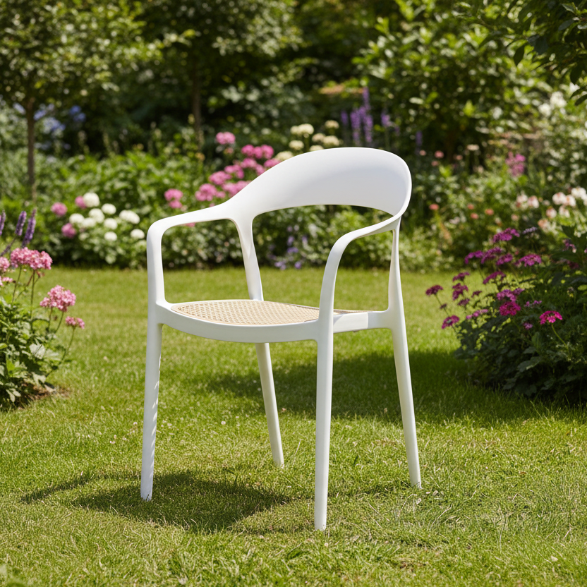 Karrigia Oron White është një kombinim elegant i stilit modern dhe elementeve natyrale, e përshtatshme për ambiente të brendshme dhe gjysmë të jashtme. Me strukturë të bardhë dhe ulëse me efekt rattan në ngjyrë natyrale, ajo sjell një pamje të freskët dhe harmonike në çdo hapësirë.