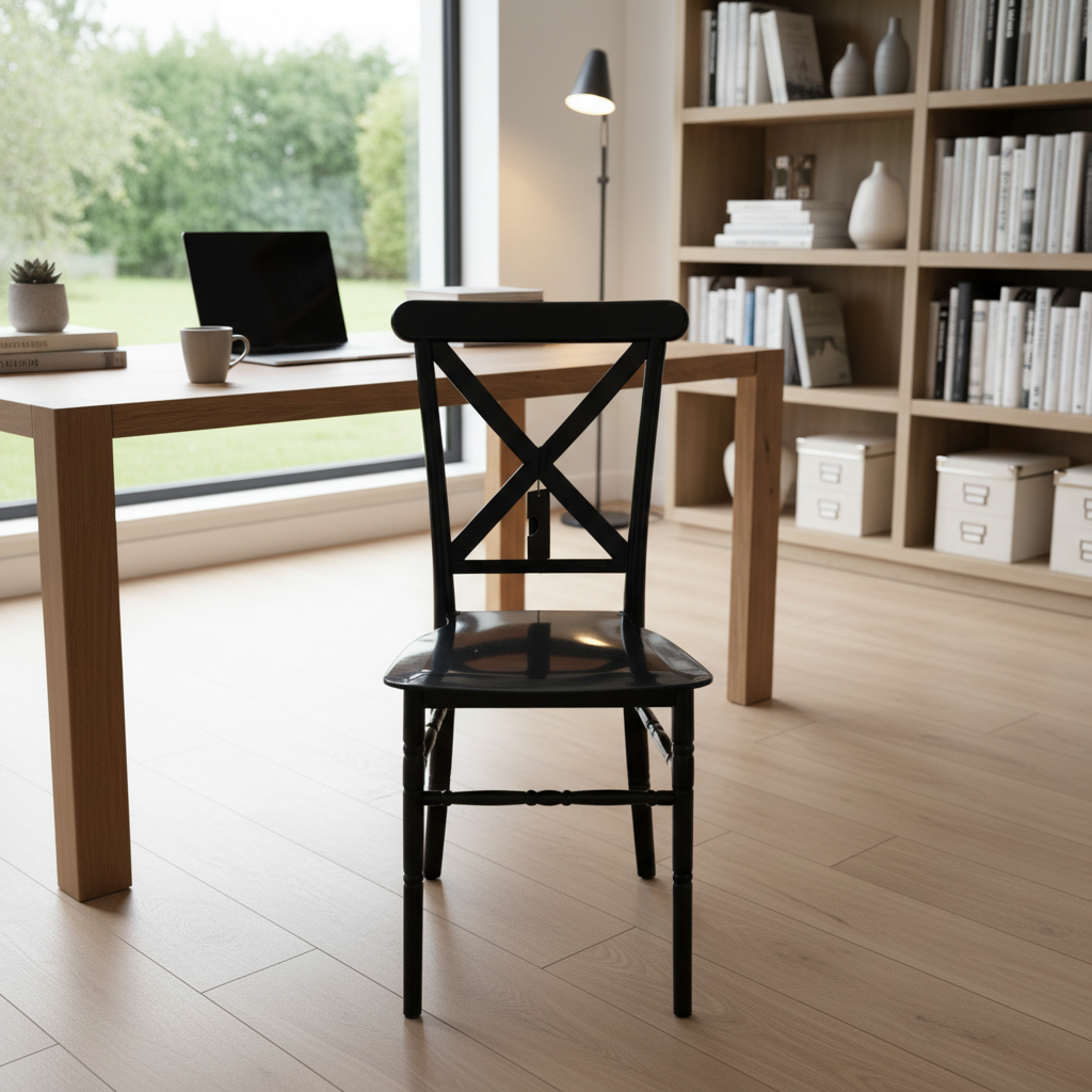 Kjo karrige outdoor plastike e zezë ofron ulje të rehatshme dhe stil modern për verandën apo kopshtin tuaj. Dizajni me shpinë kryq dhe pamja pa krahë e bëjnë të lehtë për t’u kombinuar me çdo ambient.