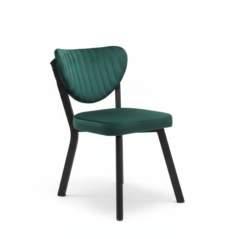 Karrige elegante me dizajn modern, e veshur me tapiceri në ngjyrë jeshile të thellë që i jep ambientit një pamje të rafinuar dhe të gjallë. Mbështetësja me formë të rrumbullakosur dhe qepje dekorative ofron rehati dhe stil, ndërsa këmbët e zeza krijojnë një kontrast bashkëkohor.