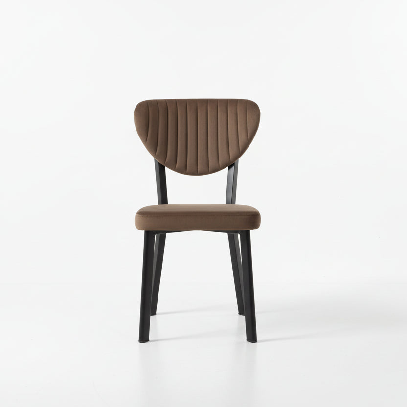 Karrige elegante me tapiceri në ngjyrë kafe, që sjell ngrohtësi dhe stil në çdo ambient. Mbështetësja ergonomike me qepje vertikale ofron rehati optimale, ndërsa struktura me këmbë të zeza garanton stabilitet dhe qëndrueshmëri.