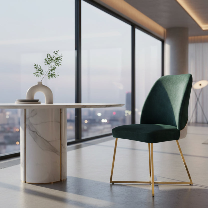 Bëni një deklaratë stili me karrigen Portugal, një ndërthurje e përsosur e dizajnit modern dhe luksit klasik. E veshur me një kadife të pasur në ngjyrë jeshile smeraldi (Emerald Green), kjo karrige sjell menjëherë një ndjesi ndryshe në ambientin tuaj.