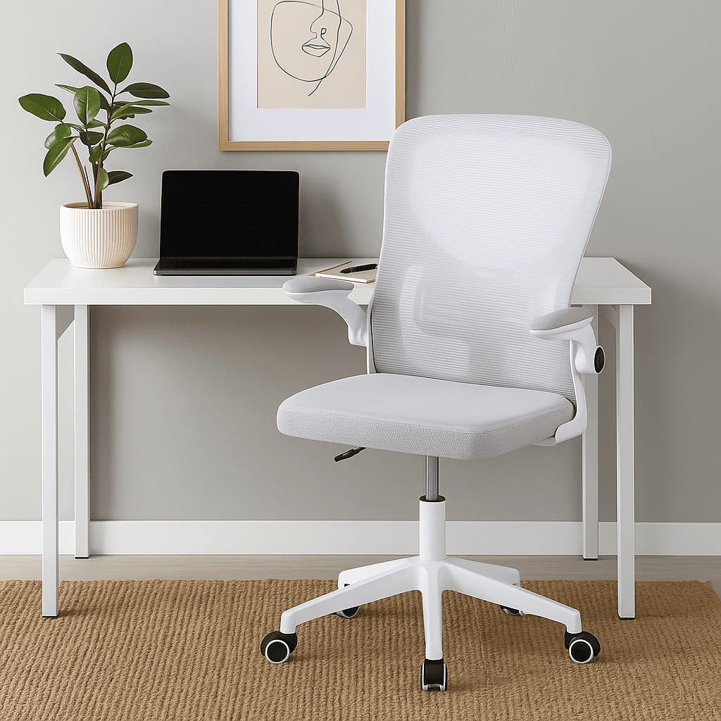 Karrigia Famara ofron një mbështetëse ergonomike të veshur me pëlhurë 3D të bardhë, me mbështetje lumbare të integruar dhe një strukturë prej polipropileni të bardhë për qëndrueshmëri dhe stil modern.