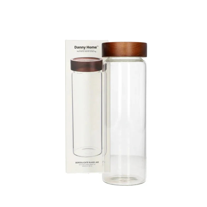 Kavanoz elegant qelqi me kapak druri akacie, ideal për ruajtjen e ushqimeve të thata.
