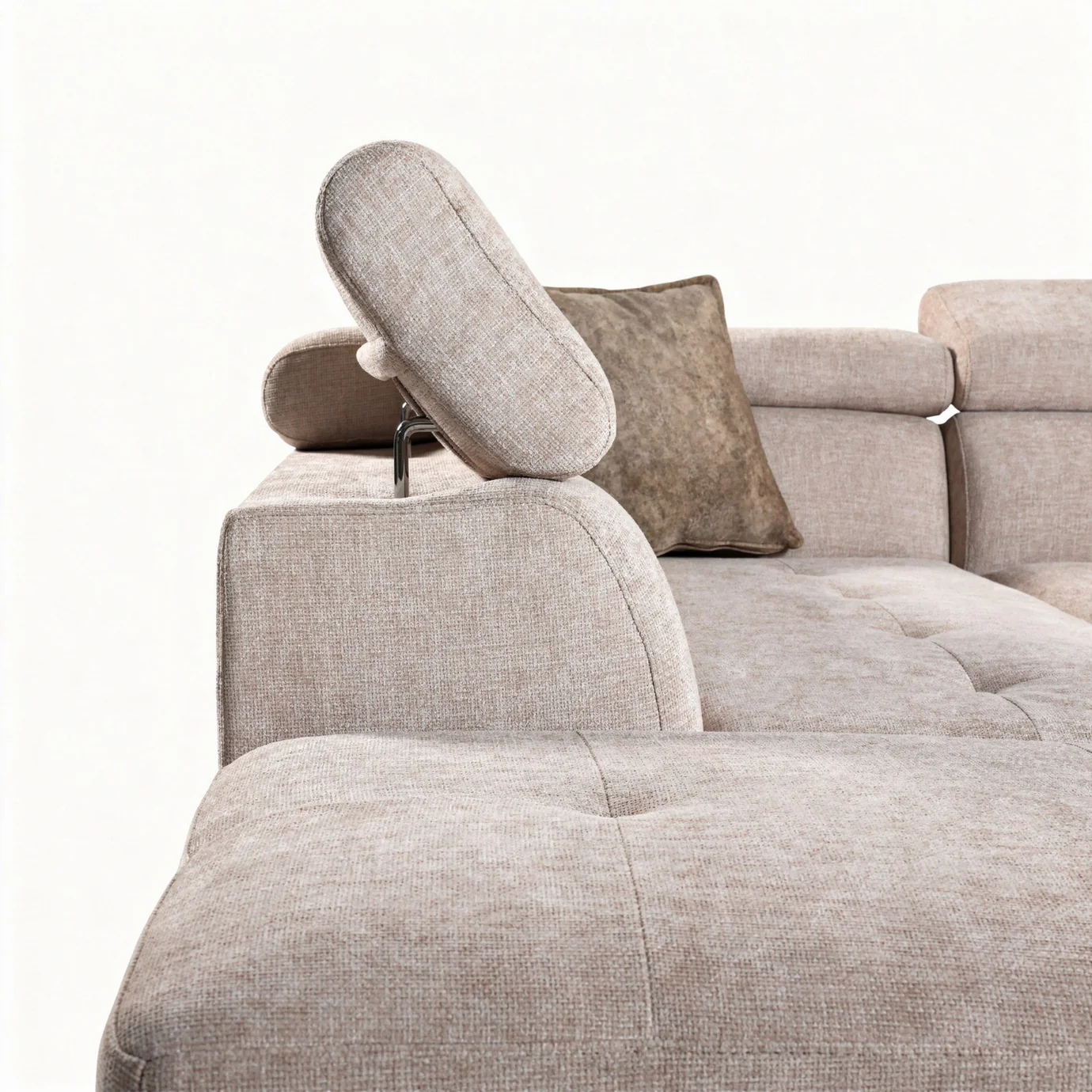 Ky divan këndor modern në ngjyrë bezhë është zgjidhja perfekte për ambiente bashkëkohore që kërkojnë stil dhe praktikë. Me dizajn minimalist dhe linja të pastra, ai përshtatet lehtësisht në çdo sallon apo dhomë ndenjeje.