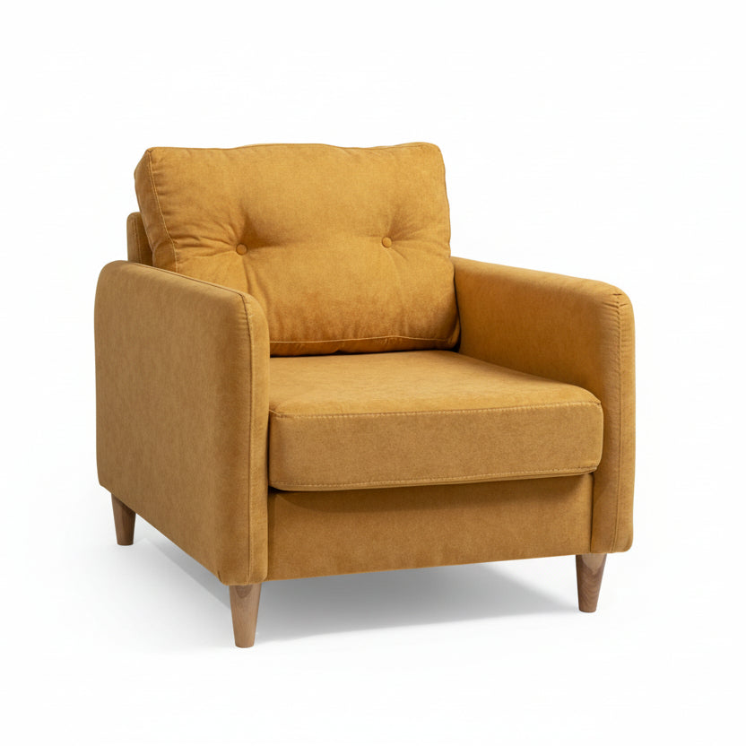 Dizajni i saj ndërthur linjat e pastra moderne me detaje klasike, si jastëku i shpinës me dy kopsa dekorative (button-tufted). Këmbët e drurit natyral i shtojnë një prekje skandinave, duke e bërë atë të përshtatshme për çdo ambient që ka nevojë për pak gjallëri dhe ngrohtësi.