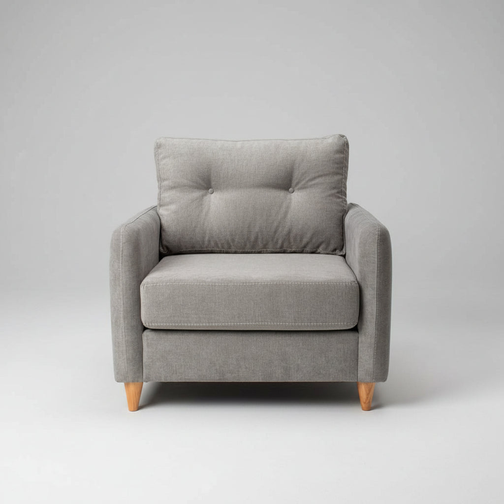 Ngjyra e saj gri e hirtë është neutrale dhe e qetë, duke e bërë atë "kameleonin" e përsosur për salotin tuaj. Një detaj që e bën të veçantë këtë model është qepja e dukshme me fije të bardhë (contrast stitching) në bordurat e krahëve dhe jastëkut, e cila i jep një kornizë të pastër dhe moderne dizajnit.