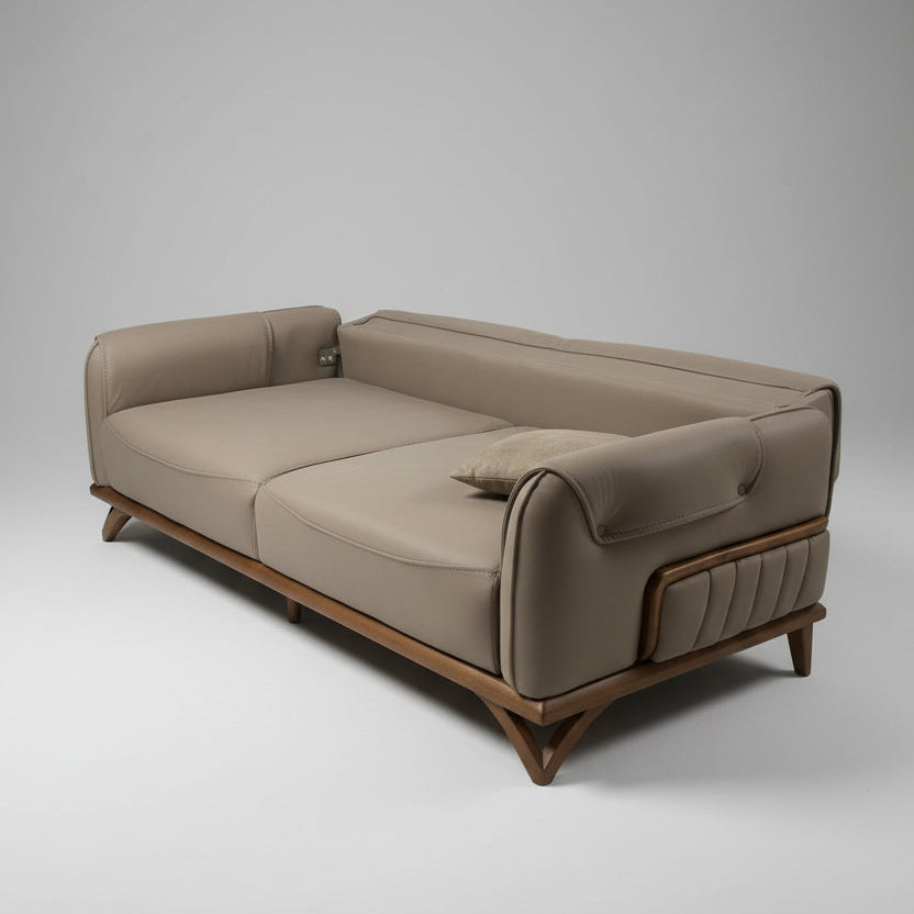 Karakteristika e tij më e veçantë është baza prej druri natyral që kornizon gjithë pjesën e poshtme dhe zgjatet në këmbët e harkuara, duke krijuar një kontrast të ngrohtë dhe organik me ngjyrën e tapicerisë.