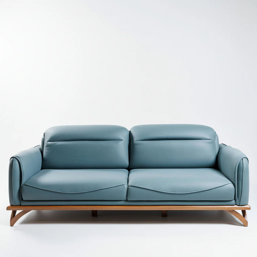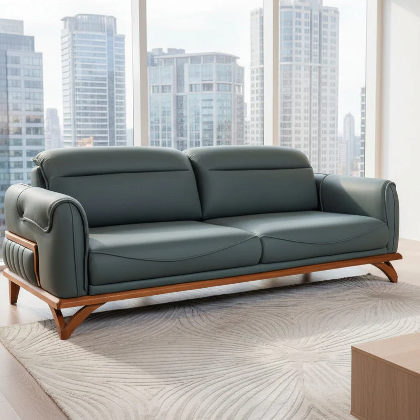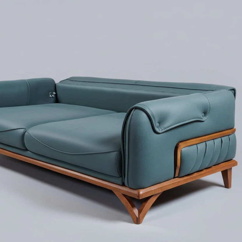 Karakteristika e tij më e veçantë është baza prej druri natyral që kornizon gjithë pjesën e poshtme dhe zgjatet në këmbët e harkuara, duke krijuar një kontrast të ngrohtë dhe organik me ngjyrën e ftohtë të tapicerisë.