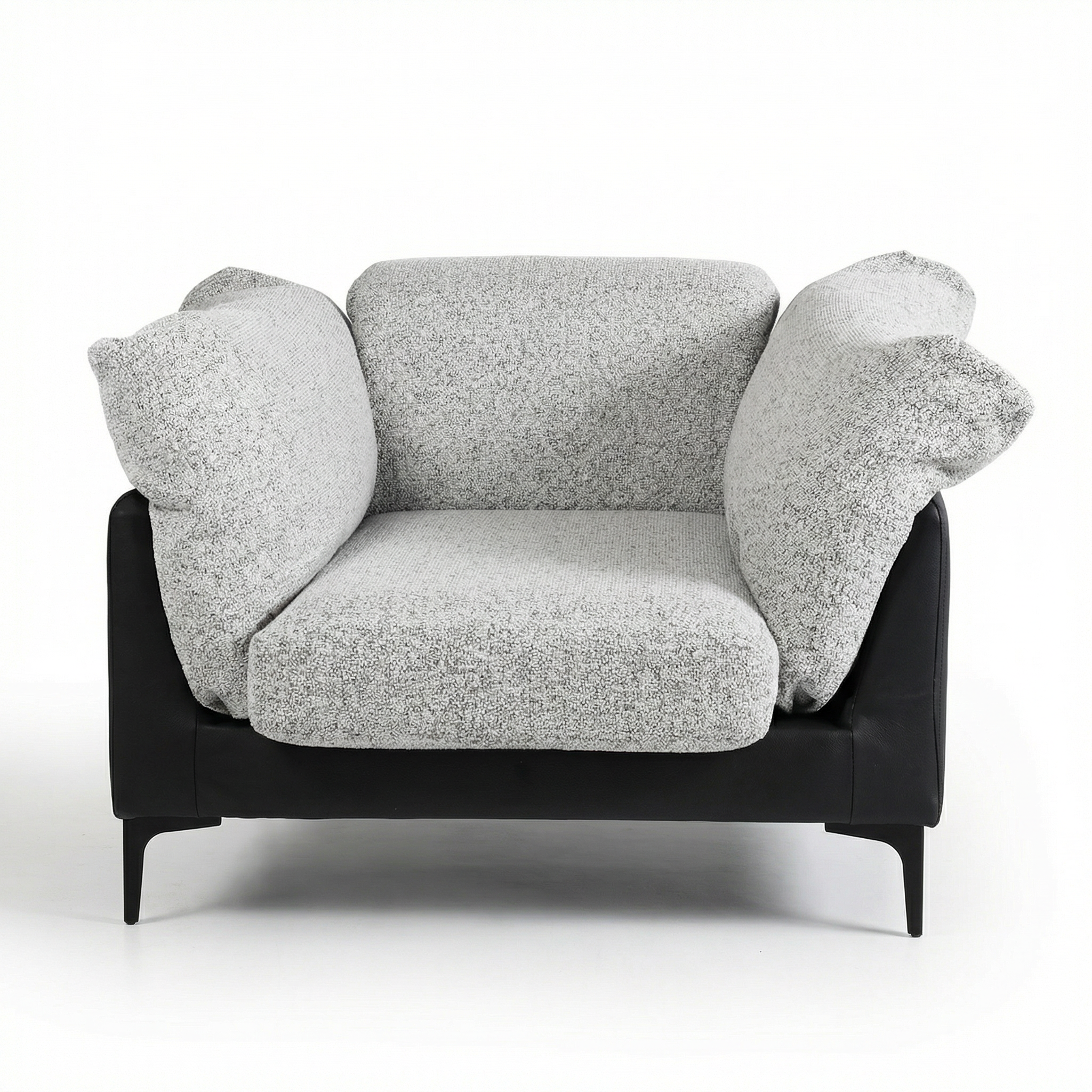 Baza e zezë me efekt lëkure i jep një kornizë moderne dhe të pastër, ndërsa jastëkët e mëdhenj me teksturë ofrojnë një përvojë uljeje si mbi re. Veçoria më tërheqëse janë jastëkët e krahëve që varen me shkujdesje mbi strukturë, duke i dhënë një pamje "casual" dhe shumë ftuese.